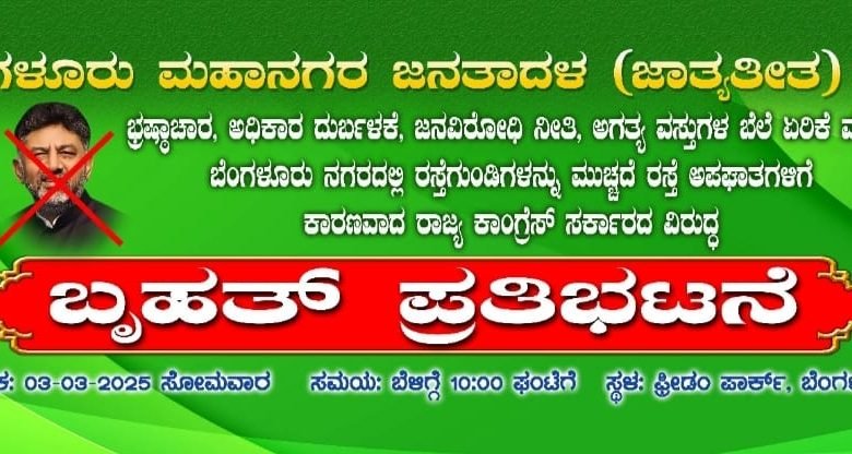 ಭ್ರಷ್ಟಾಚಾರ, ಅಧಿಕಾರ ದುರ್ಬಳಕೆ, ಜನವಿರೋಧಿ ನೀತಿ, ಅಗತ್ಯ ವಸ್ತುಗಳ ಬೆಲೆ ಏರಿಕೆ ಮತ್ತು ಬೆಂಗಳೂರು ನಗರದಲ್ಲಿ ಗುಂಡಿಗಳನ್ನು ಮುಚ್ಚದೆ ರಸ್ತೆ ಅಪಘಾತಗಳಿಗೆ ಕಾರಣವಾದ ರಾಜ್ಯ ಕಾಂಗ್ರೆಸ್ ಸರ್ಕಾರದ ವಿರುದ್ಧ ಯುವ ಮುಖಂಡರು ಹಾಗೂ ರಾಜ್ಯ ಯುವ ಜನತಾದಳದ ಅಧ್ಯಕ್ಷರಾದ ಶ್ರೀ ನಿಖಿಲ್ ಕುಮಾರ್ ಸ್ವಾಮಿ ರವರು ಹಾಗೂ ಕರ್ನಾಟಕ ವಿಧಾನಸಭೆಯ ಜೆಡಿಎಸ್ ಶಾಸಕಾಂಗ ಪಕ್ಷದ ನಾಯಕರಾದ ಶ್ರೀ ಸುರೇಶ್ ಬಾಬು. ಸಿ.ಬಿ. ರವರ ನೇತೃತ್ವದಲ್ಲಿ ಬೃಹತ್ ಪ್ರತಿಭಟನೆ ಯನ್ನು ಹಮ್ಮಿಕೊಳ್ಳಲಾಗಿದೆ.