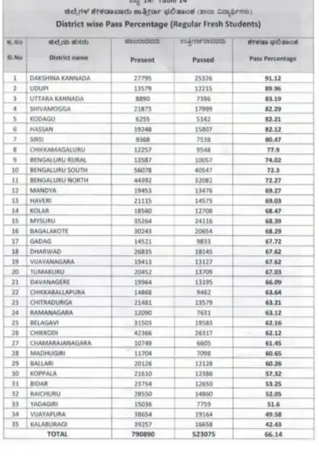 ವಿದ್ಯಾರ್ಥಿಗಳು ಫಲಿತಾಂಶಗಳನ್ನು 12.30 ರ ನಂತರ kseab.karnataka.gov.in ಅಥವಾ karresults.nic.in ನಲ್ಲಿ ಪರಿಶೀಲಿಸಬಹುದು. ಈ ಬಾರಿ 66.14 %ರಷ್ಟು ಫಲಿತಾಂಶ ಬಂದಿದೆ. ಈ ಬಾರಿ 22 ವಿದ್ಯಾರ್ಥಿಗಳು ರಾಜ್ಯಕ್ಕೆ ಪ್ರಥಮ ಸ್ಥಾನ ಪಡೆದಿದ್ದಾರೆ. ದಕ್ಷಿಣ ಕನ್ನಡ ಜಿಲ್ಲೆ ಪ್ರಥಮ ಸ್ಥಾನ ಪಡೆದಿದ್ದರೆ , ಉಡುಪಿ ಜಿಲ್ಲೆ ದ್ವಿತೀಯ ಹಾಗೂ ಕಲಬುರಗಿ ಜಿಲ್ಲೆ ಕೊನೆ ಸ್ಥಾನ ಪಡೆದಿದೆ.