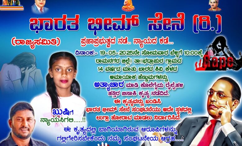 ಖುಷಿ ಎಂಬ ಈ ಹೆಣ್ಣುಮಗಳನ್ನು ಬಹಳ ಕ್ರೂರವಾಗಿ ನಾಲ್ಕರಿಂದ ಹೆಚ್ಚು ಜನ ಸೇರಿ ಅತ್ಯಾಚಾರ ಮಾಡಿ ಬೆನ್ನು ಮೂಳೆ ಮುರಿದು,ಕತ್ತು, ಕಾಲನ್ನ ತಿರುಚಿ ಬಹಳ ಹಿಂಸೆ ಕೊಟ್ಟು ಕೊಲೆ ಮಾಡಿ ರೈಲ್ವೆ ಟ್ರ್ಯಾಕ್ ಬಳಿ ಬಿಸಾಡಿದ್ದಾರೆ ಪಾಪ ಈ ಹುಡುಗಿಗೆ ಮಾತು ಬರಲ್ವಂತೆ,ಕಿವಿ ಕೂಡ ಕೇಳಿಸೋದಿಲ್ವಂತೆ ಬಡವರ ಮನೆಯ ಹುಡುಗಿ ಈ ಹೆಣ್ಣು ಮಗಳ ಅತ್ಯಾಚಾರದ ಬಗ್ಗೆ ಯಾವೊಂದು ಮೀಡಿಯಾದಲ್ಲೂ ಸುದ್ದಿಯಾಗಲಿಲ್ಲಾ…. ಈ ಕೃತ್ಯವನ್ನು ಖಂಡಿಸಿ ನಮ್ಮ ಭಾರತ ಭೀಮ್ ಸೇನೆಯ ಸಂಘಟನೆಯು ದಿನಾಂಕ 19.05.2025 ನೇ ಸೋಮವಾರ ಬೃಹತ್ ಪ್ರತಿಭಟನೆ ಹಮ್ಮಿಕೊಳ್ಳಲಾಗಿದೆ.