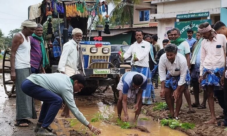 ಬ್ಯಾಡಗಿ: ತಾಲ್ಲೂಕಿನ ಚಿಕ್ಕಣಜಿ ಗ್ರಾಮದ ಬಳಿ ಬೀರೂರು-ಸಮ್ಮಸಗಿ ರಾಜ್ಯ ಹೆದ್ದಾರಿ ಹಾದು ಹೋಗಿದ್ದು, ರಸ್ತೆಯಲ್ಲಿ ಬಿದ್ದಿರುವ ಗುಂಡಿಗಳಲ್ಲಿ ರೈತ ಸಂಘದ ನೇತೃತ್ವದಲ್ಲಿ ಮಂಗಳವಾರ ಸಸಿ ನೆಡುವ ಮೂಲಕ ಗ್ರಾಮಸ್ಥರು ಲೋಕೋಪಯೋಗಿ ಇಲಾಖೆಯ ಕಾರ್ಯವೈಖರಿಗೆ ಆಕ್ರೋಶ ಹೊರಹಾಕಿದರು.